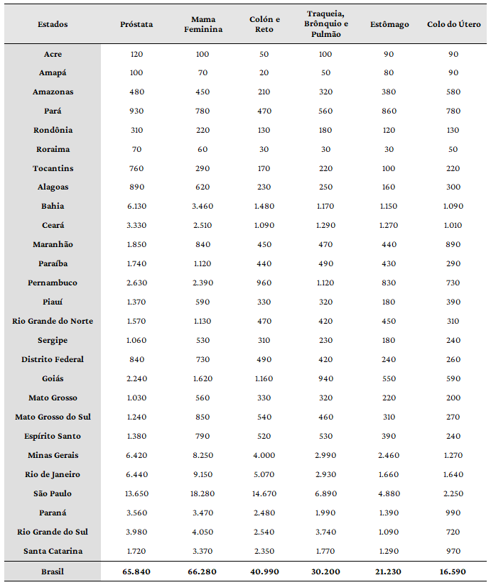 No que se refere às estimativas de novos casos por estado no Brasil, relativos aos principais tipos de câncer que acometem a população, há na Região Norte, no Amazonas, um número maior de câncer de colo de útero que supera o de próstata. Nos outros estados da mesma região, há mais casos de câncer de próstata. Nas Regiões Nordeste, Centro-oeste e Sul, o número de casos de próstata previstos supera os demais. Na Região Sudeste, os estados de Minas Gerais e Espírito Santo estão em primeiro lugar, mas nos estados do Rio de Janeiro e São Paulo o câncer de mama supera o de próstata, que fica em segundo lugar em projeções numéricas. No Rio Grande do Norte, que ocupa a décima segunda posição, as estimativas são de 1.570 novos casos de câncer para 2020, como mostra a tabela a seguir (Tabela 2).