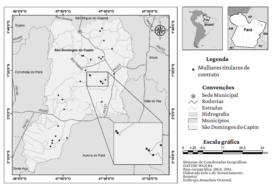 Naquele contexto, os agricultores familiares de São Domingos do Capim assinaram contratos de produção com as agroindústrias atuantes na região. No total, 226 agricultores familiares assinaram o contrato, sendo 87% assinados pelos homens e 13%, pelas mulheres até o ano de 2015 (BANCO DA AMAZÔNIA, 2015). Hoje 30 mulheres têm contratos de integração em seus nomes em São Domingos do Capim e residem em 17 diferentes localidades do município (Figura 1). Os seus contratos são com as empresas ADM e Biopalma da Amazônia S.A. (Biopalma) a partir de 2010.