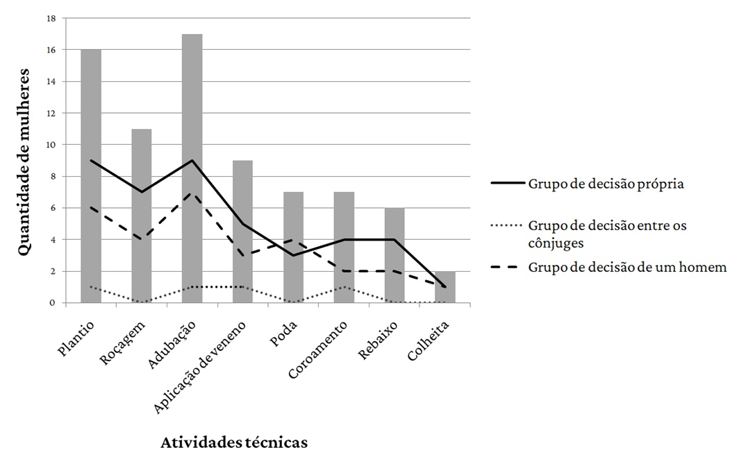 As mulheres concordam que o financiamento foi condicionado ao contrato, mas isso não significa que os recursos ficaram à disposição delas, que são titulares, já que são os homens que predominantemente os monopolizam, tendendo a decidir sobre sua utilização. Nesse universo, apenas quatro mulheres (14%) afirmaram possuir autonomia para decidir sobre os recursos financeiros. Outras 30% afirmaram que o casal decidiu, enquanto para 17 mulheres (56%), foram os homens que decidiram sobre o uso dos recursos. Nem a titularidade da terra nem o contrato foram suficientes para que as mulheres assumissem o controle dos recursos e a tomada de decisão. Mas, assim como demonstrado por Barbosa e Lerrer (2016) no que tange às mulheres beneficiadas com lotes da reforma agrária, o fato de ser a titular é determinante para que haja possibilidades de negociação das mulheres com os demais familiares.
