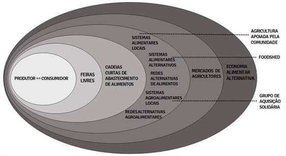 A Figura 2 sintetiza toda a teoria trabalhada nesta revisão bibliométrica, demonstrando os componentes que participam da estruturação dos mercados de agricultores e dos sistemas agroalimentares dentro da economia alimentar alternativa. As feiras livres são uma das formas de circuitos curtos que fazem parte das cadeias curtas de abastecimento de alimentos. Pertencentes aos mercados de agricultores encontram-se os sistemas alimentares locais e alternativos, as redes agro(alimentares) alternativas. Nesses sistemas e redes agroalimentares também despontam exemplos de ações como: a agricultura apoiada pela comunidade (CSA), grupo de aquisição solidária (GAS) e foodshed, que já são aplicados em algumas partes do mundo e relatam bem essa relação produtor/consumidor.