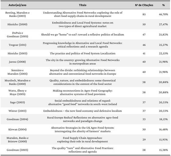 Para identificar a estrutura da produção científica sobre mercado de agricultores e sistemas agroalimentares locais foram analisadas as cocitações que evidenciam a relação entre dois artigos com base no número de publicações em que eles aparecem citados juntos. A obra Understanding Alternative Food Networks: exploring the role of short food supply chains in rural development, de Renting, Marsden e Banks (2003), foi a mais citada, com 85 ocorrências. Na Tabela 1 são apresentadas as publicações mais citadas nos 100 artigos selecionados para a AFE.