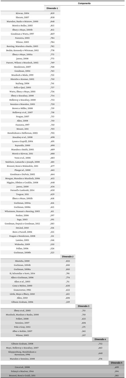 A matriz das 100 publicações mais citadas foi utilizada para a execução da análise fatorial exploratória. Com a AFE foi possível avaliar os padrões existentes entre as publicações citadas pelos 184 artigos sobre os mercados de agricultores e os sistemas agroalimentares locais. No SPSS, cada publicação foi tratada como uma variável.