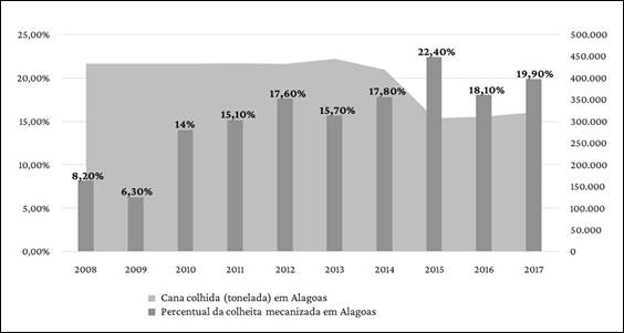 No contexto alagoano, a mecanização dos processos de produção canavieira e, mais especificamente, o de colheita não têm ocorrido nos mesmos moldes das principais regiões produtoras do Centro-Sul. Pode-se perceber que houve um aumento nos percentuais de colheita mecanizada nos canaviais de Alagoas no período de 2008 a 2017. Contudo, esse aumento teve, no máximo, o desempenho de 22,40% da cana-de-açúcar colhida de forma mecânica no ano de 2015, percentual muito inferior aos principais produtores do país. Para um estado que ocupou, até 2008, a vice-liderança nacional na produção de açúcar, como é o caso de Alagoas, compreender a dinâmica que envolve a incorporação de tecnologias na fase da colheita nos canaviais se faz necessário.