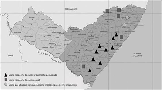 O contexto de produção e comercialização da cana-de-açúcar alagoana não está dissociado dos movimentos anteriormente descritos, tampouco das vinculações com o mercado internacional. Observa-se que o apelo ambiental, principalmente no que diz respeito à questão das queimadas, é mais intenso na região produtora do Centro-Sul do país. O caso paulista, com seu Protocolo Agroambiental, é o exemplo mais ilustrativo, embora tal movimento por adequação ao modelo de produção sustentável esteja disseminado em todo o setor nacional. Há casos nos quais a incorporação é mais intensa, como o Centro-Sul, ao passo que em outras localidades o processo de adequação ao modelo sustentável de produção se dê de forma mais lenta e pontual, como se pode observar na Região Nordeste e, particularmente, em Alagoas. Os números encontrados nos canaviais alagoanos para a mecanização, no entanto, são significativamente inferiores àqueles encontrados nas demais regiões produtoras do país.