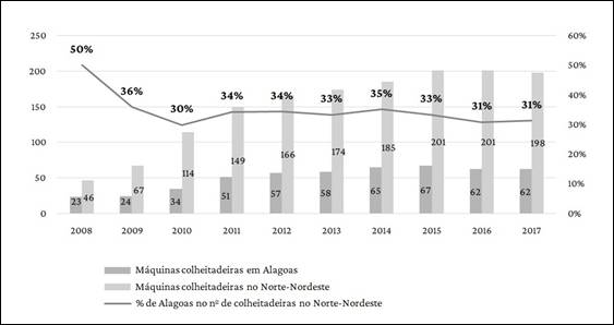 Em Alagoas este processo não se deu de modo diferente, sendo observada redução no número de unidades produtivas, bem como da área plantada entre 2008 e 2017. Por conta da crise, o capital para investimento foi sendo reduzido, ou mesmo extinto, e a falta de recursos financeiros conduziu a uma quebra no processo de incorporação de tecnologia direcionada aos canaviais. Tal fato pode ser verificado a partir do número crescente na aquisição de colheitadeiras desde 2010 e que se estabilizou a partir de 2014. Contribuindo para o agravamento da crise, soma-se o fato de que algumas unidades produtivas foram fechadas no estado ou acabaram entrando em recuperação judicial.