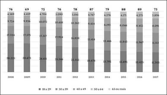 Ao recorrer às informações do Relatório Anual de Informações Sociais (Rais) para analisar a faixa etária dos trabalhadores manuais, a partir da ocupação “Trabalhador da cultura da cana-de-açúcar”, percebe-se, no Gráfico 3, um movimento de envelhecimento dos trabalhadores lotados nesta ocupação. Os jovens entre 18 e 29 anos representavam 47% do total de trabalhadores na ocupação, em 2008, e passaram a representar 33%, em 2017. Em contraposição a este grupo, a faixa etária entre 40 e 49 anos passou de 16%, em 2008, para 23%, em 2017. A faixa que compreende os trabalhadores com 40 anos é a que sofre menor variação no período analisado, diferentemente daquilo que ocorre nas faixas dos mais jovens (até 29 anos), em que há redução, em números absolutos, de 16.922 trabalhadores.