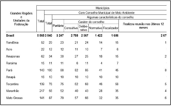 No ano de 2002, constata-se que apenas 22% dos municípios amazônicos possuíam conselhos municipais de meio ambiente e 17% tiveram reuniões nos últimos 12 meses daquele ano. Em todos esses casos, a participação da sociedade civil foi bastante escassa nos municípios (IBGE, 2012). Em 2012, 51% dos municípios da Amazônia Legal contavam com conselhos ambientais, um número que, apesar de ainda insuficiente, demonstra que houve um esforço político para a tomada de decisões em igualdade de condições entre atores governamentais e sociedade civil. Reforça essa afirmação o fato de 82% desses conselhos terem caráter deliberativo para 71% de caráter consultivo e 48% e 54%, respectivamente, para conselhos normativos e fiscalizadores. Cabe ressaltar que 77% dos conselhos ambientais tiveram reuniões pelo menos anuais.