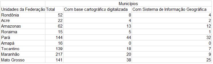 Como demonstra o Quadro 3, dos 808 municípios dos estados que compõem a Amazônia Legal, apenas 300 possuem base cartográfica digitalizada ou SIG, o que é pouco para as necessidades demandadas pelas ferramentas usadas à regularização ambiental.