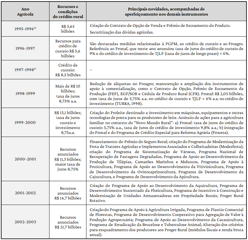 Confluente com esta interpretação e visando colocar o setor (agricultura) em coerência com o “global”, em toda a década, as principais ações de política agrícola utilizados basearam-se no crédito rural (de forma bem diminuta em relação às décadas anteriores e privilegiando fontes não públicas de recursos), na securitização das dívidas do setor, na política de garantia de preços mínimos, e em novos instrumentos que articulam parcerias entre o governo e a iniciativa privada (como a Cédula do Produtor Rural, o Contrato de Opção de Venda, e o Prêmio para Escoamento de Produto) (LEITE, 2001; REZENDE, 2001; BUAINAIN; SOUZA FILHO, 2001; DELGADO, 2012 – também ver Quadro 1). Como afirma Delgado (2012), foi um período de reformas na política agrícola no sentido de “desconstrução do “modelo” anterior” que orientou o projeto de modernização da agricultura, marcado pela forte intervenção do Estado na agricultura e na integração desta com a indústria”. Políticas públicas foram sendo minimizadas, apostando na estabilidade econômica e na competitividade do setor.