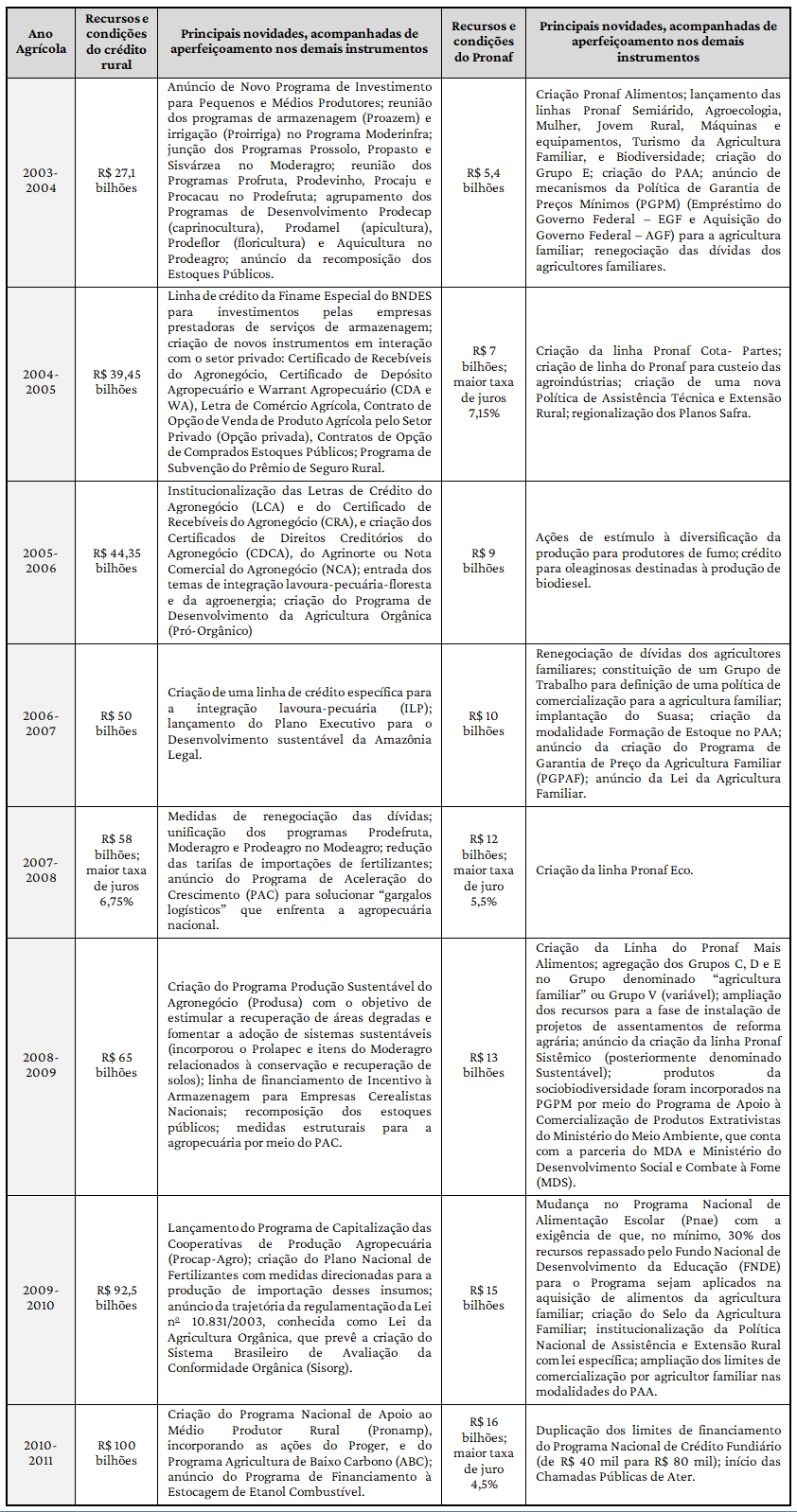 Para o fortalecimento desta “economia do agronegócio”, anunciava-se como medidas fundamentais: a) a preservação da estabilidade econômica; b) a continuidade e a ampliação da oferta de crédito rural, com condições creditícias cada vez mais favoráveis (Quadro 2); c) a continuidade e o incremento nas ações de infraestrutura, notadamente com as ações do Programa de Aceleração do Crescimento (PAC) a partir de 2007, quando mudanças em termos de rodovias, ferrovias, hidrovias e portos passaram a receber ênfase e ganhar mais espaço nos documentos; e d) a criação de novos instrumentos com a participação da iniciativa privada, como o Programa de Subvenção ao Prêmio do Seguro Rural (PSR), Certificado de Recebíveis do Agronegócio (CRA), Certificado de Depósito Agropecuário e Warrant Agropecuário, Contrato de Opção de Venda de Produto Agrícola pelo Setor Privado, Contratos de Opção de Compra dos Estoques Públicos e Letras de Crédito do Agronegócio (Quadro 2).