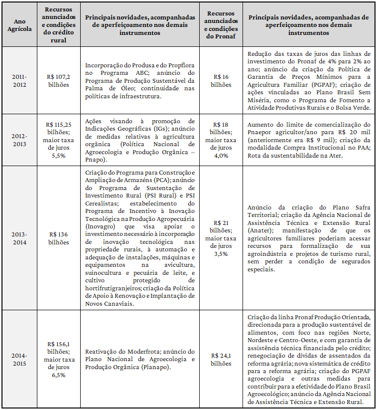 No que se refere aos PSAFs, também é possível observar continuidades e aprofundamentos das orientações dos governos Lula no primeiro mandato da Presidente Dilma. A partir de um referencial neodesenvolvimentista, tornava-se importante continuar estimulando econômica e produtivamente parte da agricultura familiar, e melhorar as condições de vida, garantir renda e oportunizar consumo para segmentos em maior vulnerabilidade social. Para atender a finalidade de inserção produtiva e econômica, o Pronaf permaneceu sendo a principal política agrícola direcionada para a agricultura familiar e os recursos anunciados cresceram de R$ 16 bilhões no PSAF 2011/2012 para R$ 24,1 bilhões no PSAF 2014/2015, acompanhados de redução das taxas de juros, ampliação dos limites de financiamento (Quadro 3).