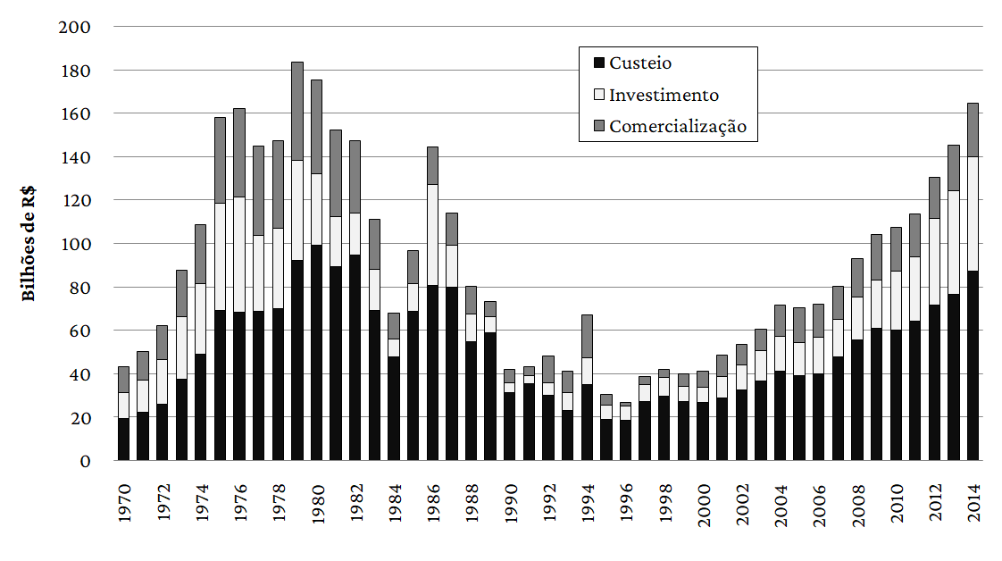 Observa-se que em termos de finalidade, o crédito de custeio, em especial aquele voltado a atividades agrícolas, foi predominante na oferta geral. Após a década de 1970, sua participação foi superior a 50% em todos os anos. A modalidade de comercialização chegou a ocupar a segunda colocação em alguns períodos (entre 1977 e 1985, além da primeira metade da década de 1990), quando atendeu unidades de beneficiamento e processamento das grandes e médias cooperativas e agroindústrias. O crédito rural para investimento, por sua vez, foi muito expressivo em toda década de 1970, quando foi amplamente usado para compra de máquinas e implementos agrícolas, seguindo a lógica do processo de modernização da agricultura. Depois da crise fiscal, que marcou o desempenho do SNCR entre 1980 e 1996, os recursos para investimento ganharam, aos poucos, novo crescimento. Isso ocorreu principalmente quando os programas do Banco Nacional de Desenvolvimento Econômico e Social (BNDES) assumiram um papel central nos investimentos destinados ao setor primário, com destaque para o Programa de Modernização da Frota de Tratores Agrícolas e Implementos Associados e Colheitadeiras (Moderfrota) (LEITE; WESZ JUNIOR, 2014).