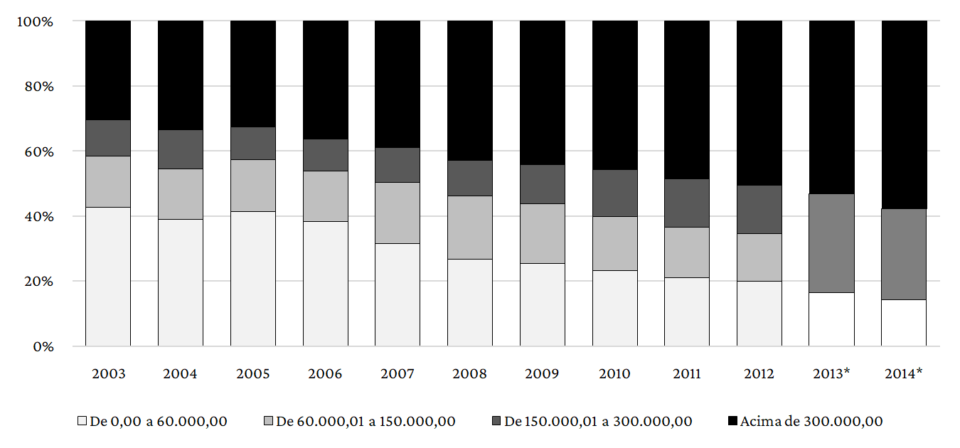 O crescimento no volume de recursos do SNCR nos últimos anos do período analisado, conforme visto no Gráfico 1, não foi acompanhado por uma alteração substantiva no modelo de distribuição anterior, revelando-se muito mais como um elemento de continuidade do que de descontinuidade do Sistema. Outro aspecto a ser ressaltado é a concentração dos recursos nos contratos de maior valor. Os dados indicam que, apesar da massiva participação dos menores contratos no número total de operações do SNCR – sempre acima de 90% do total, decorrente principalmente do Pronaf –, cerca de 50% dos valores emprestados em 2012 foram destinados para contratos cujos valores superam R$ 300 mil, ou seja, acima do teto do Pronaf Mais Alimentos, modalidade destinada a investimentos agropecuários, válido até a safra 2015/2016. Esse movimento de concentração ocorreu a partir de 2005, quando esse intervalo de maior valor passou de 33% para 51% do montante global. Em 2003, os contratos com valores inferiores a R$ 60 mil respondiam por 43% dos recursos aplicados, mas em 2014 perderam peso relativo, alcançando menos de 20%. Já os estratos intermediários mantiveram seus percentuais relativamente estabilizados ao longo do período (Gráfico 2).