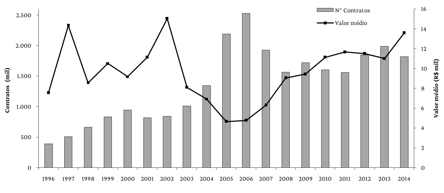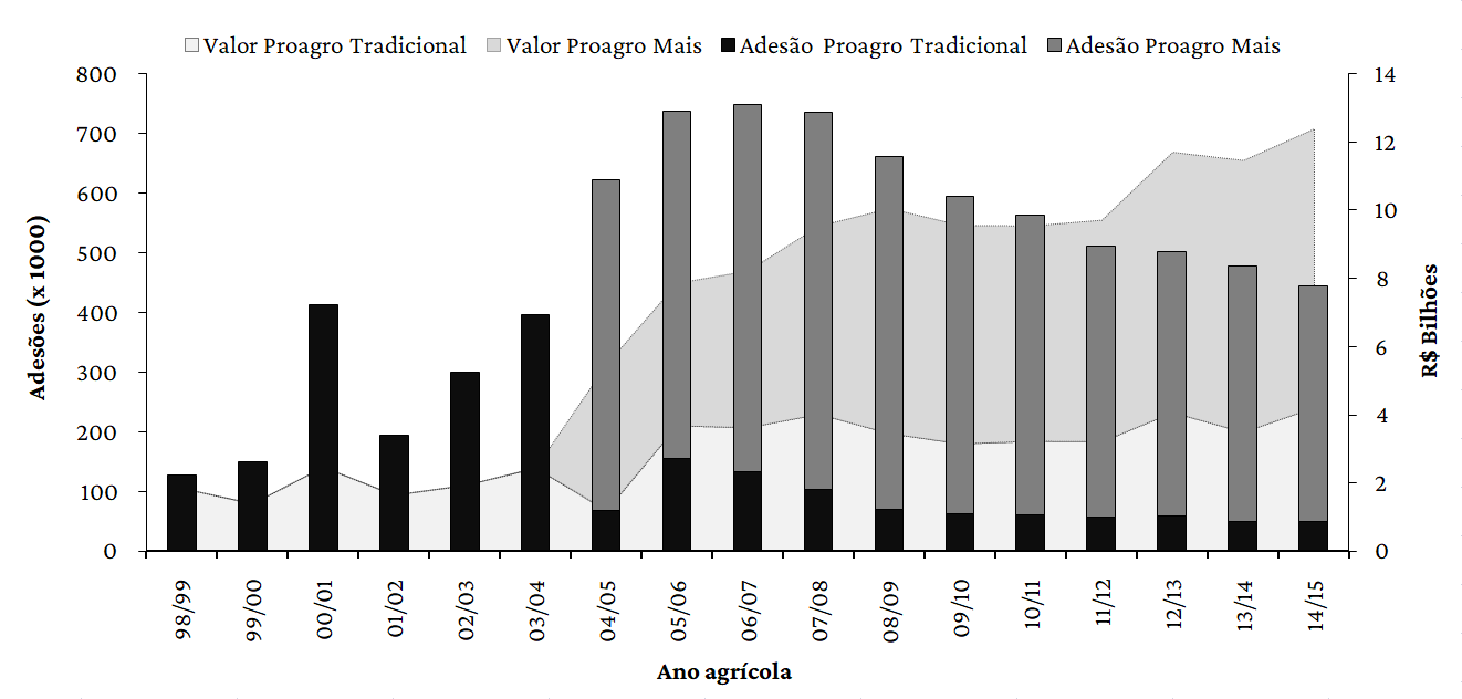 Com base nos dados do BC para o período 1998-2014, é possível verificar que o Seaf alterou o quadro do seguro agrícola no Brasil, pois ampliou de forma significativa o montante de beneficiários e os valores segurados (Gráfico 7). O ano agrícola 2004/2005 registrou uma queda do número de contratos e a elevação no valor médio enquadrado no Proagro tradicional, resultado da migração de muitos agricultores para a modalidade do "Proagro Mais".