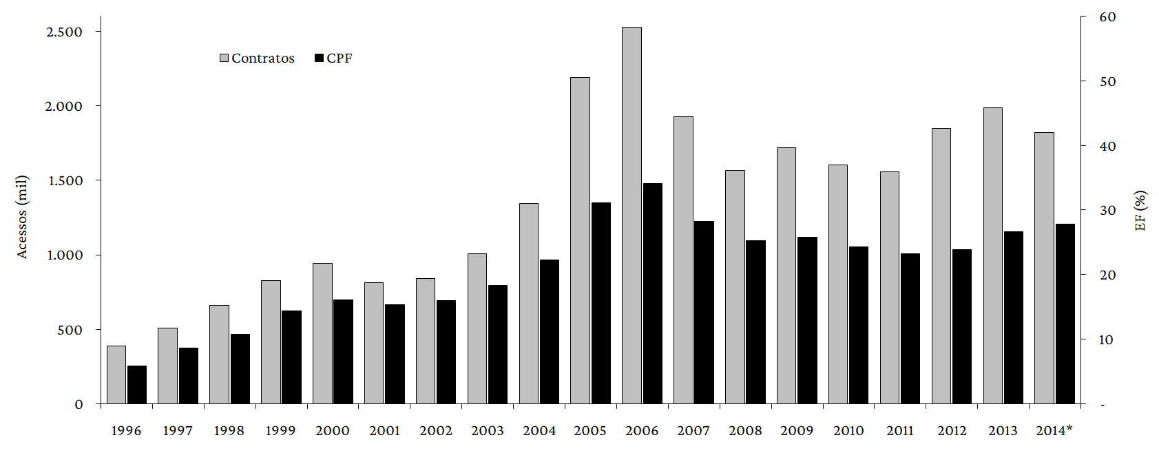 Mesmo tendo ocorrido incrementos no acesso do público potencialmente beneficiário, Capellesso, Cazella e Búrigo (2018) demonstram que o nível de exclusão de agricultores familiares do Pronaf é maior do que normalmente se dimensionava pelo uso do número de contratos que eram divulgados pelo extinto MDA. Esse indicador não evidenciava o real número de estabelecimentos beneficiados por mais de um contrato em um mesmo ano agrícola (custeio agrícola, custeio pecuário, investimento agrícola e investimento pecuário). A análise do acesso a financiamentos do Pronaf a partir dos Cadastros de Pessoa Física (CPF) evita esse tipo de sobreposição e revela que o público beneficiário era bem inferior ao apontado pelo número de contratos (Gráfico 5). Para o ano de 2013, por exemplo, considerando que cada estabelecimento tenha efetuado apenas uma operação, os 2.099.279 contratos de Pronaf teriam alcançado 48% do total de estabelecimentos classificados como familiares pelo Instituto Brasileiro de Geografia e Estatística (IBGE) no Censo Agropecuário de 2006. Quando calculado pela quantidade de CPF dos beneficiados, o total de contemplados cai para 1.154.613, o que era equivalente a 26,4% do público potencial (BC, 2016; IBGE, 2009).11