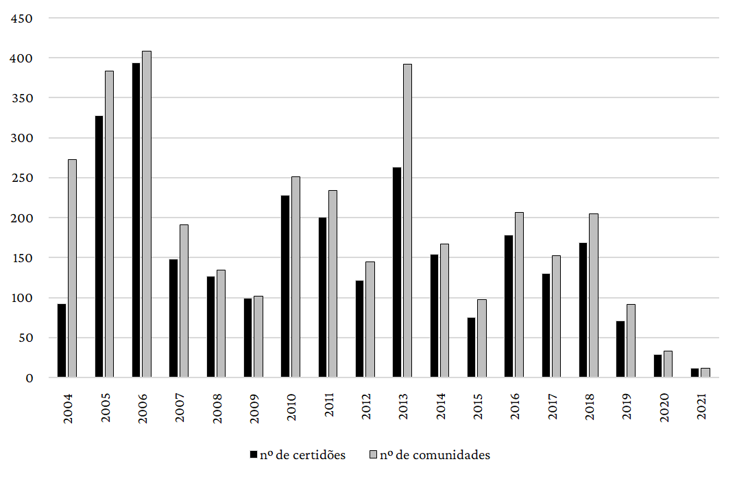 O Gráfico 1 permite visualizar a evolução na certificação de comunidades quilombolas ao longo do tempo. Pode-se perceber que os primeiros anos após a assinatura do Decreto no 4.887/2003 correspondem ao período de maior intensidade na certificação de comunidades quilombolas no país, com outro momento de ápice no ano de 2013, seguindo tendência acentuada de queda a partir de 2019.