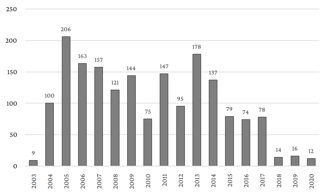 Por sua vez, foram abertos 1.805 (mil, oitocentos e cinco) processos de titulação de territórios quilombolas nas superintendências regionais do Incra, evidenciando a amplitude que essa política ganhou no país. O Gráfico 2 apresenta a evolução na abertura dos processos de titulação de territórios quilombolas no período entre 2003 e 2020.