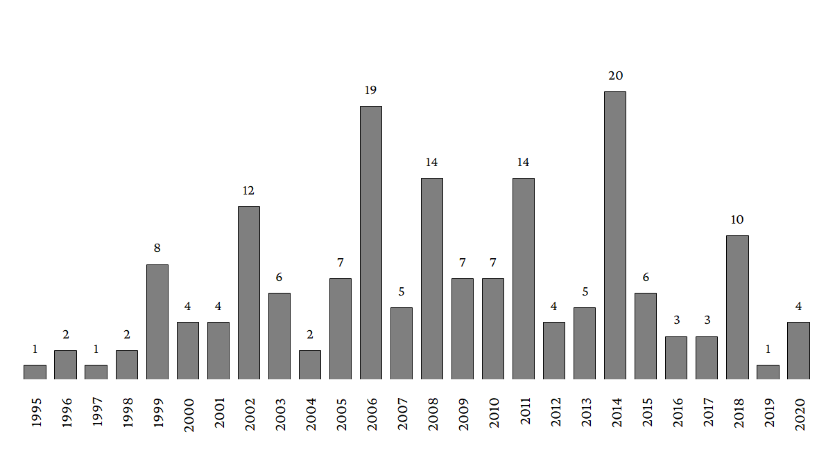 Deste modo, a primeira iniciativa para a abertura do processo de titulação como terra de quilombo corresponde ao reconhecimento da autoatribuição identitária de comunidade quilombola perante a Fundação Cultural Palmares. Até o ano de 2021, foram expedidas 2.811 (duas mil, oitocentas e onze) certidões de remanescentes das comunidades de quilombos, contemplando 3.471 (três mil, quatrocentas e setenta e uma) comunidades8 no país (FCP, 2021). Tendo por referência a data de publicação da Portaria de reconhecimento no Diário Oficial da União (DOU), foi elaborado o Gráfico 1.