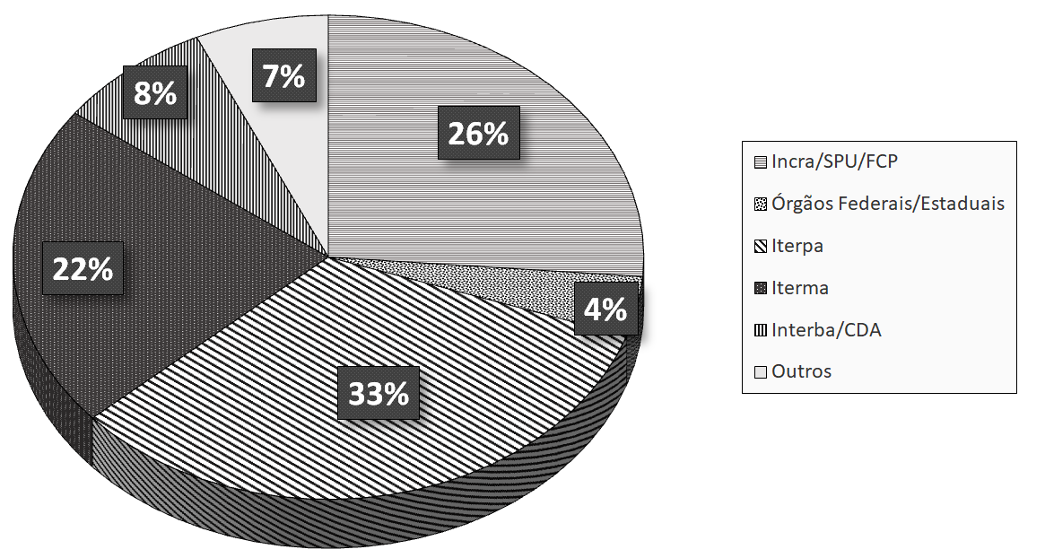 No Gráfico 4 é possível verificar que os governos estaduais foram responsáveis por cerca de 3/4 dos territórios titulados, compreendendo uma área de 816.185,8772 hectares. Entre esses, destacam-se o Iterpa e o Iterma, os quais efetuaram a titulação de, respectivamente, 58 (cinquenta e oito) e 38 (trinta e oito) territórios quilombolas. Já os órgãos federais, correspondentes ao Incra, Fundação Cultural Palmares e Secretaria do Patrimônio da União (SPU), foram responsáveis pela titulação de 42 (quarenta e dois) territórios, abarcando 204.615,6310 hectares. Por sua vez, 7 (sete) territórios foram titulados conjuntamente entre órgãos federais e estaduais, enquanto a titulação de um território ficou a cargo da Prefeitura Municipal de Santarém, no estado do Pará (INCRA, 2021a).