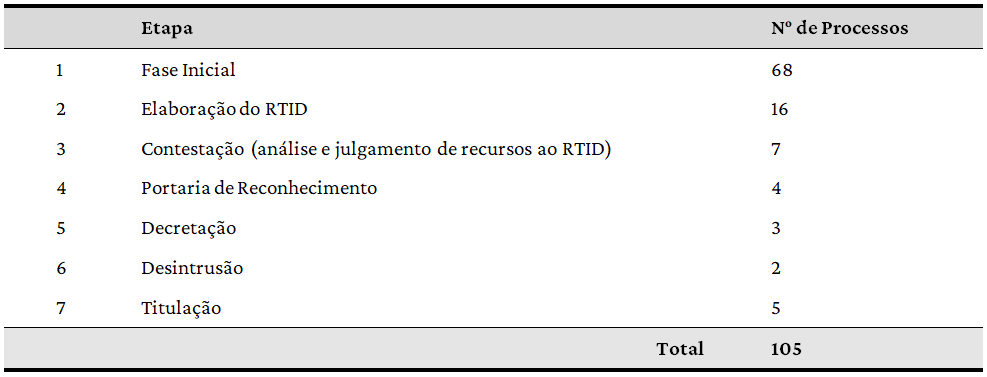 Ao se comparar o número de territórios titulados perante os processos abertos, percebe-se que a emissão do documento definitivo equivale a cerca de 10% dos casos. Buscando explicações para o baixo desempenho do Estado na efetivação dos direitos territoriais dos quilombolas, focaliza-se o estado do Rio Grande do Sul, em que foram abertos 105 (cento e cinco) processos de titulação de territórios quilombolas na Superintendência Regional do Incra até o ano de 2020. Desses processos, cerca de 2/3 ainda se encontravam na fase inicial, com poucas ações além do recebimento do número de protocolo por parte do Incra/RS. A Tabela 1 apresenta a distribuição dos processos de titulação de territórios quilombolas entre as etapas.