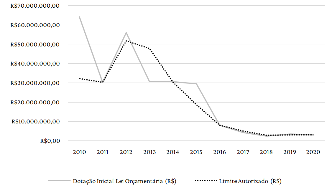 Assim, as disputas em curso na sociedade se refletem na ação do Estado por meio de sucessivos bloqueios a determinadas pautas. Um desses bloqueios corresponde à imposição de cortes orçamentários, reduzindo os recursos disponibilizados para a regularização de territórios quilombolas, tal como alertado por entidades que efetuam o monitoramento da política de titulação de territórios quilombolas (CPISP, 2018). Entre os anos de 2010 e 2020, o orçamento do Incra para a ação de Reconhecimento e Indenização de Territórios Quilombolas sofreu drástica redução, como pode ser visualizado no Gráfico 5.