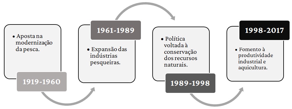 Desde os primeiros atos regulatórios com a criação das colônias de pesca pela Marinha do Brasil, em 1919, até o momento atual,4 conta-se um século de política pesqueira num quadro de dez órgãos responsáveis por sua gestão. Essas instituições deixaram marcas que se alastraram ao longo do tempo nas ações dirigidas à pesca, construindo trajetórias que, embora não lineares, podem ser entendidas como articuladas por meio dos seus direcionamentos – a modernização e a tecnificação do setor. Propomos uma interpretação desse processo a partir de quatro movimentos:5 1) modernização da pesca; 2) expansão das indústrias pesqueiras; 3) ênfase nas políticas de conservação dos recursos naturais; 4) fomento à produtividade industrial e aquicultura.
