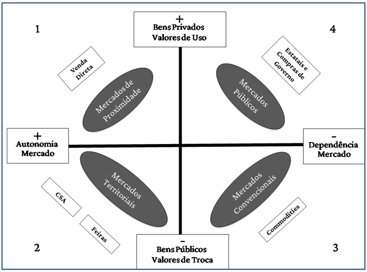Em relação às iniciativas de agricultura familiar, conforme a Figura 1, é possível classificar os mercados em quatro tipos: os mercados de proximidade social, territoriais, públicos e convencionais. Nos mercados públicos, estariam políticas governamentais conhecidas no Brasil como o Programa de Aquisição de Alimentos (PAA) e o Programa Nacional de Alimentação Escolar (Pnae). Os mercados convencionais seriam aqueles que transacionam commodities agrícolas. Nestes dois tipos de mercados a característica principal é que os atores sociais atuantes, como os agricultores familiares, possuem pouca autonomia e muita dependência comercial, tendo em vista que as regras e normas de funcionamento são ditadas por outros atores sociais com mais poder. No caso dos mercados convencionais, por exemplo, grandes empresas agroindustriais controlam as cadeias de comercialização. Já nos mercados públicos, o papel principal cabe ao Estado, que pode destinar mais ou menos recursos para estas iniciativas, bem como modificar as regras de regulação das trocas.