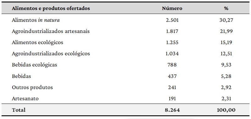 Compete frisar que a oferta de alimentos in natura foi registrada em 30,27% das iniciativas, quase 1/3 do que é disponibilizado nos sites. Geralmente, são frutas, verduras, raízes, tubérculos, grãos e cereais. Em seguida aparecem os produtos agroindustrializados artesanais com 21,99% das observações, geralmente mel, queijos, embutidos, panificados, doces de frutas, cacau e conservas vegetais. Somados, estes dois percentuais atingem mais da metade de todos os alimentos e produtos ofertados nestes mercados digitais (52,26%). Por seu turno, considerando somente a categoria alimentos, em que os alimentos in natura (30,27%) e os ecológicos (15,19%) totalizam quase metade do que é ofertado (45,46%), percebe-se a relevância deste tipo de item diferenciado nas experiências.