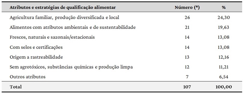 Em menor medida há outros atributos de qualificação alimentar que são mobilizados, como os ligados à boa qualidade das matérias-primas e dos alimentos das agroindústrias, ao zelo pelo bem-estar dos animais, aos cortes especiais de carnes, à adoção dos princípios da segurança alimentar e às boas condições sanitárias dos alimentos. Estas estratégias aparecem em 6,54% dos sites investigados. Ao todo, conforme mostra a Tabela 7, 107 diferentes estratégias de qualificação alimentar foram identificadas nos 38 sites estudados, uma média de quase três (2,81) estratégias acionadas por cada experiência que formou a amostra da pesquisa.