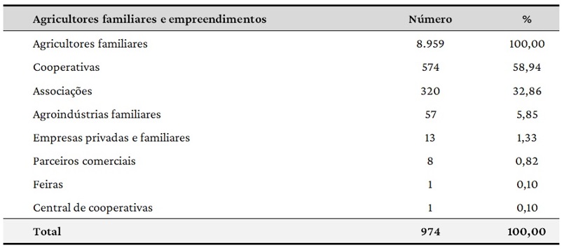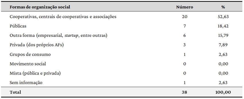 A pesquisa de Cubides Zuñiga, Cubides Zuñiga e Lugo (2020), sobre as plataformas de vendas da agricultura familiar durante a pandemia da Covid-19, identificou dados parecidos a esta investigação. As autoras afirmam que há três frentes principais das iniciativas, sendo que 32% dos casos compreendem relações entre AFs com associações e cooperativas, 29% com agentes públicos (governos e universidades) e 27% com agentes privados (empresas). O restante das observações estava agregada numa rede mista (agentes públicos, privados e organizações internacionais), representando 12% dos casos estudados.