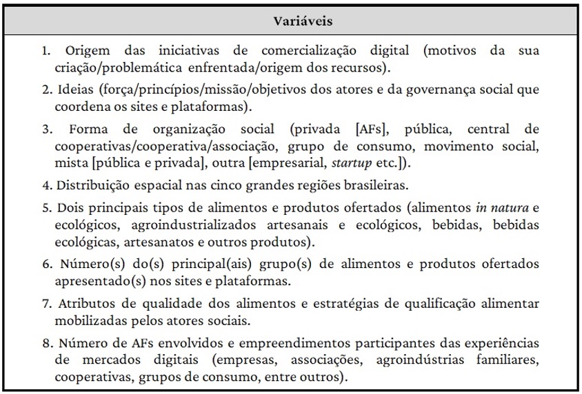Na sequência, foi realizada uma consulta aos sites e plataformas selecionados, no sentido de verificar as informações, dados e números que poderiam ser trabalhados na pesquisa. Desta primeira análise (mais superficial) dos sites e plataformas, foram construídas oito (8) variáveis exploradas no artigo, descritas no Quadro 1, as quais constituíram o banco de dados das experiências de comercialização estudadas.