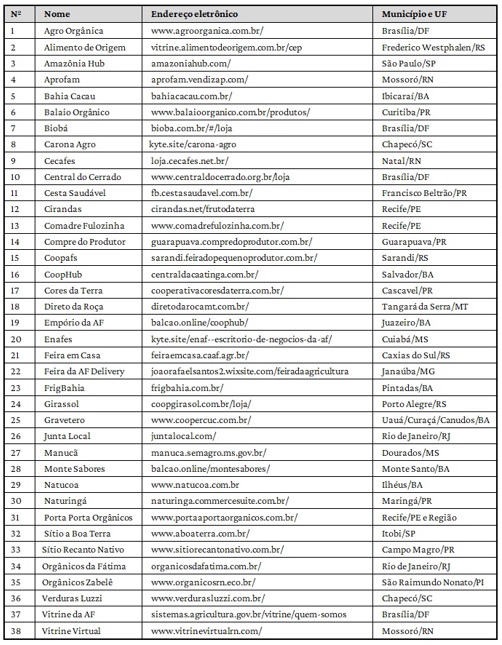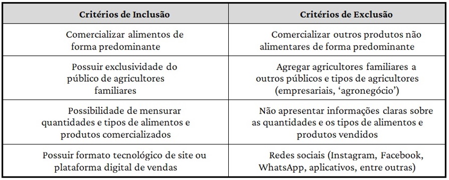 Em princípio, buscou-se na internet por sites e plataformas digitais que comercializassem alimentos e produtos dos agricultores familiares. Chegou-se ao número de 50 sites e plataformas de vendas. Esta pesquisa foi realizada usando-se as seguintes expressões: “vendas de alimentos on-line, sites e plataformas, agricultura familiar”; “vendas de alimentos, sites e plataformas, agricultura familiar”; “comercialização, agricultura familiar, sites e plataformas”; “mercado, agricultura familiar, sites e plataformas”; “orgânico e agroecológico, comercialização, agricultura familiar, sites e plataformas”; “produtos orgânicos e agroecológicos, comercialização da agricultura familiar, sites e plataformas”.