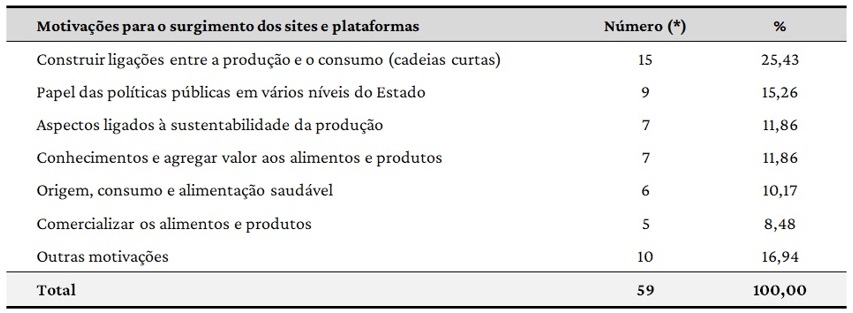 A outra origem dos sites e plataformas é formada por uma diversidade de aspectos multifacetados, que perfazem 16,94% das observações encontradas. Na lista desses aspectos aparece um conjunto variado de motivações para formalizar experiências da agricultura e agroindústria familiar, a própria pandemia da Covid-19 (explicitada claramente em três sites), a busca de relações mais igualitárias de gênero e juventude, a tentativa de melhoria dos processos de geração de renda dos AFs, o estimulo à participação política dos atores e a promoção da produção dos AFs com selo Senaf (Selo Nacional da Agricultura Familiar).