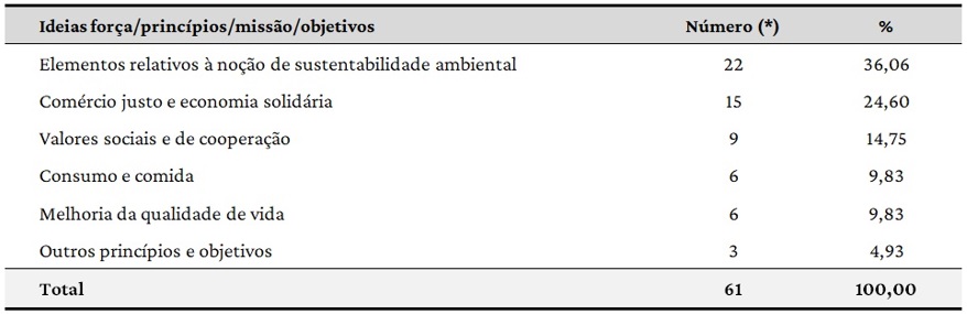 Com menores percentuais na Tabela 2, entre as ideias-força e princípios em que se baseiam as experiências, estão as preocupações no que se refere ao consumo consciente e à ‘comida boa’ (9,83%), à melhoria da renda e da qualidade de vida dos agricultores e consumidores (9,83%) e outros princípios e objetivos, com 4,93% (melhorar a comercialização e serviços da AF, apoiar processos de desenvolvimento regional e garantir a segurança dos consumidores). Tanto os princípios concernentes ao consumo quanto os que versam sobre a melhoria da qualidade de vida dos atores, especialmente por uma alimentação mais saudável, dirigem-se no sentido do conceito de consumidor politizado e reflexivo em relação às suas escolhas e aos gastos com alimentação, como várias pesquisas têm ressaltado (SOUZA; CALDAS, 2018; PORTILHO, 2020).