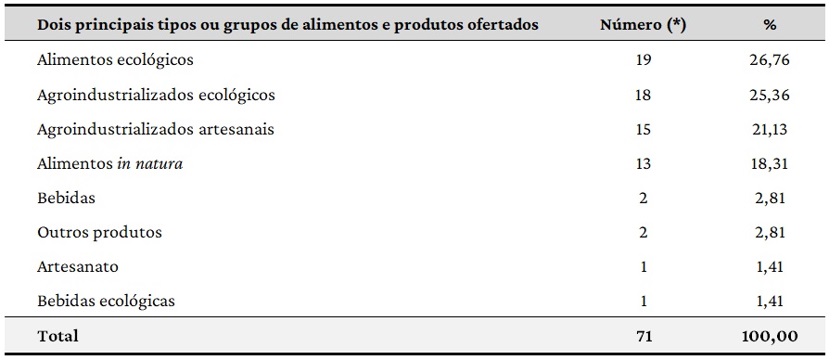 Além da distribuição espacial no território brasileiro, analisou-se os tipos de alimentos e produtos ofertados nos sites e plataformas da AF, como apresentado nas Tabelas 5 e 6. A Tabela 5 elenca apenas os dois tipos ou grupos principais de alimentos e produtos que estão sendo vendidos pelas experiências, sendo que, em cinco casos, o site apresentava apenas um tipo de alimento ou produto. Os produtos ofertados também foram analisados seguindo uma divisão em: alimentos ecológicos ou in natura, produtos agroindustrializados ecológicos ou artesanais, bebidas ecológicas ou não, outros produtos e artesanato, de maneira a criar uma tipologia dos alimentos e produtos ofertados digitalmente.