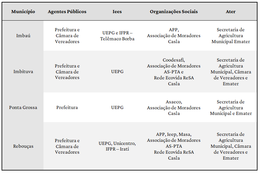 Para buscar dar conta de uma cartografia9 minimamente representativa da territorialização de atores, discursos e racionalidades envolvidas no processo de disputa pela legitimação de projetos (discursos, saberes e práticas ) agroecológicas, tomou-se por base as experiências do Programa UNItinerante (https://parlamentounitinerante.blogspot.com) e dos projetos NEA Territórios Faxinalenses (https://gpinterconexoes2.blogspot.com), financiados pelo CNPq e em desenvolvimento na Região dos Campos Gerais e Centro-Sul paranaense desde o ano de 2010.