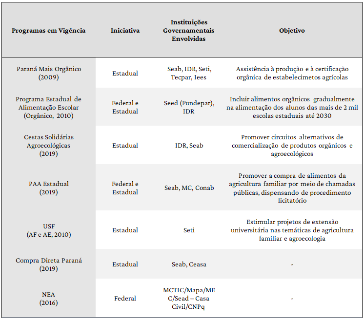 O conjunto de políticas públicas do governo do estado do Paraná, elencado no Quadro 2, busca especificamente promover a assistência técnica e a comercialização de produtos da agricultura familiar de base ecológica. Desse conjunto, destaca-se o Programa Paraná Agroecológico, revogado em março de 2020, que tinha o objetivo de promover ações integradas entre os municípios, organizações da sociedade civil e outras instituições públicas ou privadas, para implantação, consolidação e ampliação de sistemas de produção e consumo com base em princípios da agroecologia no Paraná. Tais ações eram dirigidas preferencialmente a agricultores familiares e suas organizações, técnicos, pesquisadores, professores, estudantes e organizações do setor público e da sociedade civil organizada, e consumidores e suas organizações (SEAB-PR, 2016).