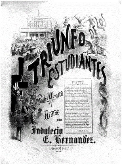 De qué matices nos perdemos cuando la música se queda guardada pudiera ilustrarlo el caso de una curiosa polca escrita en 1884 por Indalecio Hernández, un compositor prácticamente desconocido para los estudiosos del tema. Recordemos que muchas piezas compuestas en el siglo XIX contienen referencias o citas del Himno Nacional cuyo evidente designio era la invocación de un sentido patrio.8 En algunas ocasiones, incluso, la cita musical del himno adquirió claros tintes políticos como lo demuestra el singular caso de la música que nos ocupa, escrita a raíz de la votación de la denominada “deuda inglesa”. En noviembre de aquel año, una multitud de estudiantes tomó las galerías del Congreso al momento en que se sometía para su aprobación una iniciativa que habría de endeudar enormemente al país. Los estudiantes presionaron con gritos, silbidos y alharacas, y en buena medida dieron bríos a dubitativos legisladores que, al finalizar la sesión, desecharon la gravosa propuesta.9 A esta votación se le llamó “El triunfo de los estudiantes” y, ni tardos ni perezosos, dos compositores de moda -José M. Careaga e Indalecio E. Hernández- lanzaron al mercado dos piezas semejantes: Polka de los estudiantes que Careaga dedicó “a la entusiasta juventud estudiosa por sus heroicos esfuerzos en bien de la Patria” y El triunfo de los estudiantes, polka heroica e himno cuya carátula, por cierto, Hernández hizo ilustrar con un soneto de Félix Trilles Gil y dibujos que muestran no los símbolos patrios estudiados por Zárate Toscano sino gendarmes que sueltan macanazos. Pero si la viñeta es interesante por documentar la represión, es en las pautas donde surge lo extraordinario pues la pieza termina con una invocación del Himno Nacional, a tiempo de polca, que habrá despertado síntomas de pertenencia y exaltación patria en más de uno (véanse Imágenes 1 y 2).