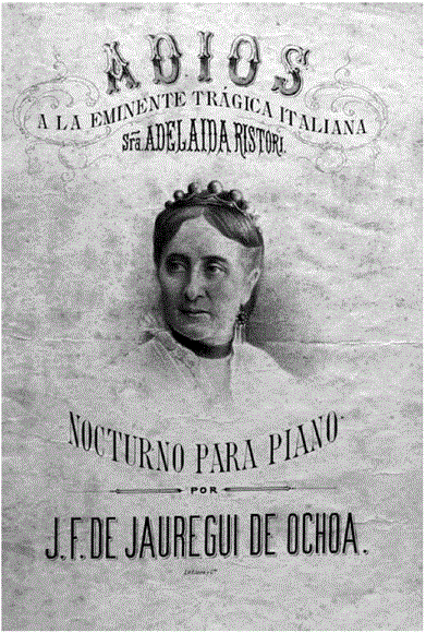 Al mismo tiempo, cuando Zárate Toscano o Pérez Salas dejan de ser historiadoras de lo cultural y sintetizan o repiten cuestiones musicológicas, terminan por escribir acerca de conceptos con los que los musicólogos vivimos cotidianamente -romanticismo y nacionalismo sólo son los dos más relevantes entre ellos- y repiten, sin duda involuntariamente, ideas y prejuicios que el uso incorrecto de estos términos han esparcido, como plaga, en la historiografía musical. Para quedarnos con un ejemplo, es evidente que el romanticismo musical ha sido plenamente malentendido a propósito de la música mexicana.10 Se trata, en realidad, de un término complejo que es, al mismo tiempo, un estilo y una ideología, como ha explicado brillantemente Isaiah Berlin.11 Si queremos estudiar el romanticismo musical mexicano -pero ello es por ahora un simple deseo, una tarea del todo pendiente desde el punto de vista musicológico- habremos primero de reunir un corpus de obras musicales que nos permitan seguir, en términos cronológicos, el cultivo de ciertos géneros: nocturnos, romanzas sin palabras, impromptus, ensoñaciones, piezas de carácter. No sabemos, para decirlo pronto, de qué estamos hablando porque la tarea de precisar el simple inventario de este repertorio no ha sido realizada. Si acaso es evidente que la referida colección de piezas características de Luis Hahn es, en efecto, uno de los más importantes puntos de partida para estudiar este fenómeno que fue nutrido por plumas tan ilustres como las de Aniceto Ortega, Melesio Morales, Guadalupe Olmedo y Julio Ituarte, antes de aflorar con fuerza en las páginas de salón y de concierto de los notables compositores porfirianos. Pero, sólo por dar una idea del asunto, tomemos como simple muestra el asunto de los nocturnos, género favorito de Schumann y Chopin y uno de los más entrañablemente románticos. Uno de los nocturnos mexicanos más interesantes que conozco es la composición de J. F. de Jáuregui de Ochoa, intitulado Adiós, partitura escrita en 1875 en honor de la famosa actriz Adelaida Ristori (véase la Imagen 3). Se trata de una pieza donde apreciamos, como en Chopin, una bella melodía de largo aliento que se sobrepone a un acompañamiento regular. Pero es en el contraste de su sección segunda donde nos damos cuenta que su autora entendió perfectamente el carácter del género al ofrecernos una sección intermedia de contraste y fuerza; fueron esos gestos inesperados, esas transiciones abruptas, como las explica Berlin, lo que hizo que el nocturno fuera un género emblemático entre los compositores románticos y lo que esta rara partitura mexicana claramente entiende. Desde luego, los comentarios anteriores no son sino una observación preliminar que busca, simplemente, explicar por qué el romanticismo en el repertorio mexicano del siglo XIX ha sido objeto de malentendidos y es un tema, en realidad, no estudiado en absoluto. De modo que cuando leemos, como afirma Pérez Salas, que “durante el siglo XIX la sociedad mexicana adoptó el estilo romántico, entendiendo este como una visión del mundo y una sensibilidad específicas…” se impone una denominación que es flagrantemente contraria a la mayoría de las partituras que dicha autora explora en su ensayo.