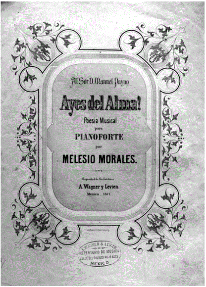 Del anterior esbozo de imprentas e impresores se desprende con claridad una serie de tareas futuras. La primera, sin duda, es el estudio de cómo las suscripciones de partituras se transformaron con el paso de los años y los cambios que tuvieron lugar en el mercado musical. En tal sentido la recuperación de las partituras que conformaron las más famosas suscripciones es una tarea pendiente aunque tal vez imposible de lograr a cabalidad. Me refiero a reunir la música que alimentó series emblemáticas como fueron la de Mariano Elizaga,18 el Instructor Filarmónico de Gómez,19El Museo filarmónico que Rivera y Fierro lanzó hacia 1844 y que en 1851 alcanzaba su tercer tomo, El repertorio, periódico musical publicado por Manuel Murguía,20 la colección de partituras que Rivera imprimió para la Sociedad Filarmónica Mexicana (véase la Imagen 5) y El ramo de flores, la prolija entrega de partituras que lanzó Jesús Rivera y Río (J. Rivera e Hijo y Compañía) que alcanzó ocho tomos. Hubo también, en la época menos estudiada hasta ahora, suscripciones musicales interesantes de las que no parece haber mayores pistas: véase por ejemplo la interesante carátula de la partitura denominada Autores mexicanos, una curiosa imagen donde se promueve La lira de oro, periódico musical auspiciado por F. Murguía (véase la Imagen 6). Aparecen ahí, en cada hoja de una planta imposible, los nombres de los más importantes compositores del momento: José Antonio Gómez, Agustín Caballero, Antonio Valle, Felipe Larios, Luis Pérez de León, Sabas Contla, Jesús Valadéz, José María Bustamante, Cenobio Paniagua, Agustín Mendoza, Joaquín Beristáin, Juan N. Loretto, Baltazar Gómez, Melesio Morales, Octaviano Valle, Luis Baca y Mariano Elízaga. No son las anteriores listas completas ni de colecciones ni de autores, pero tenerlas estudiadas, catalogadas y, en la medida de lo posible, reunidas e inventariadas supondría un avance mayor. Si concedemos, pese a toda suerte de reservas musicológicas, que la obra de los compositores porfirianos ha sido mucho más estudiada, es en el amplio conjunto que estos periódicos y suscripciones musicales lanzaron donde se encontrará el grueso del elefante en la habitación, el conjunto aun inexplorado de partituras que habrán de nutrir una visión más informada y documentada del trayecto histórico de la música mexicana del siglo XIX. Lo que las esporádicas incursiones a este mare magnum revelan es hasta ahora contradictorio: de un lado se advierten piezas par ticu larmente interesantes -las multicitadas piezas de Hahn o algunas de las que contiene el Álbum musical de la Peralta, al que me referiré más adelante- que, sin embargo, parecen ser excepcionales entre un conjunto lleno de piezas que no denotan mayor interés musical. Desde luego, la música para piano de los compositores como Aniceto Ortega, Tomás León, Melesio Morales o Guadalupe Olmedo aguarda un estudio que les haga justicia. Pero se trata de compositores situados al final de la época que nos ocupa o quienes francamente, como Morales, siguieron activos hasta el siglo XX. En todo caso, las pocas piezas para piano de estos autores que sí se conocen, en particular los nocturnos de León, algunas espléndidas piezas como la Invocación a Beethoven de Ortega, la Segunda Reverie de Olmedo o la muy interesante Ayes del alma, una “poesía musical” de Morales publicada por Wagner en 1877 (véase la Imagen 7) son obras que se alzan muy por encima de la enorme cantidad de música de baile y de piezas de salón que nutrieron aquellos periódicos y que ya incluso exasperaba al mismo Altamirano: