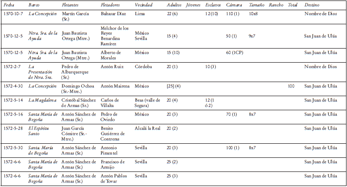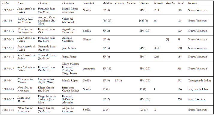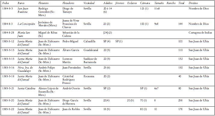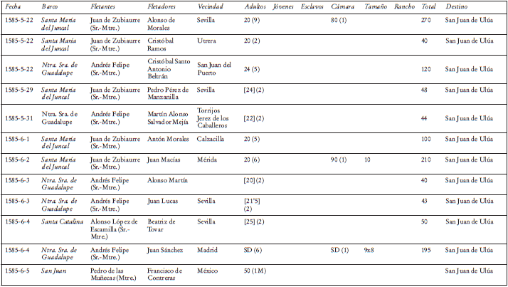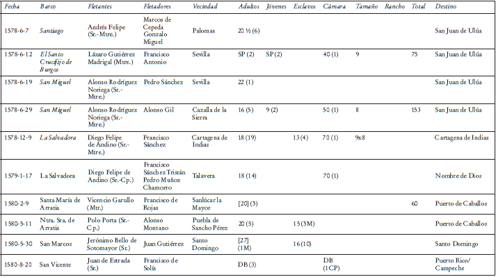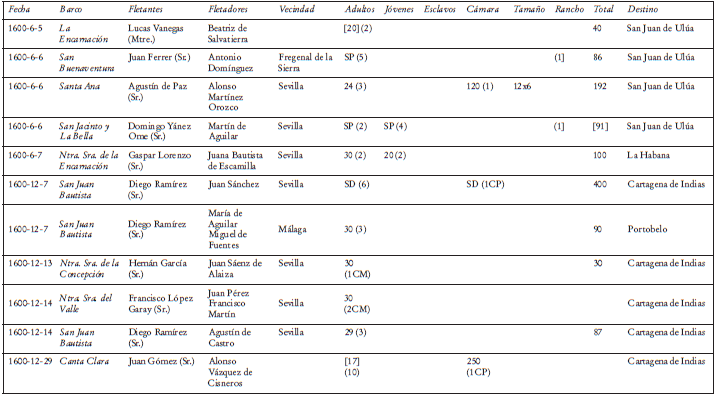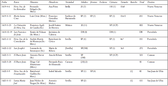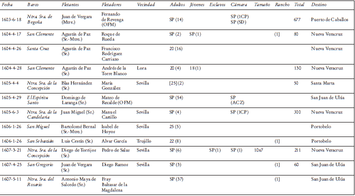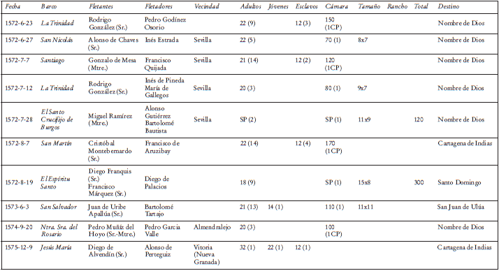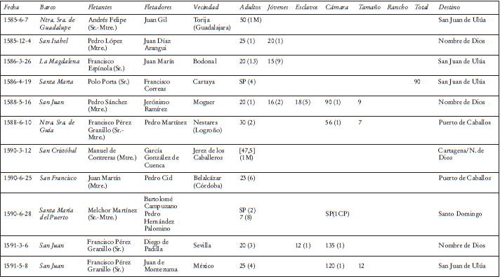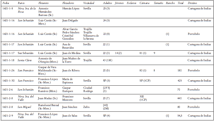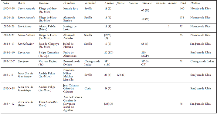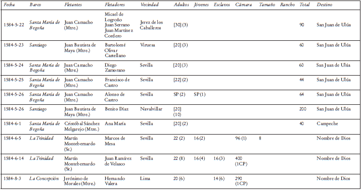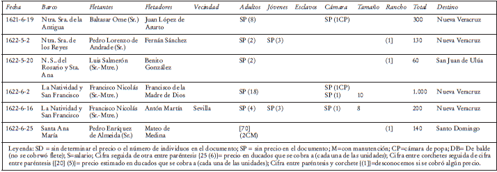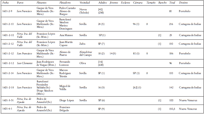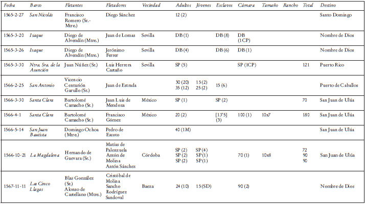 La columna vecindad hace referencia a la que poseen los fletadores o pasajeros. Ocurre a veces que si los fletadores son varios tenga cada cual una vecindad distinta. En este caso, la vecindad aparece alineada con el nombre correspondiente; si es común, se coloca centrada en la celda de la tabla, abarcando a todos. Los tres ramos siguientes (adultos, jóvenes, esclavos) tocan al precio del pasaje por individuo, según edad (joven o adulto) o condición jurídica (esclavo). Siempre se emplean dos números, el segundo de ellos entre paréntesis. La primera cifra es el precio del pasaje expresado en ducados (375 maravedís) por cada persona: el número entre paréntesis indica la cantidad de personas en cada categoría. Ejemplos: 24 (11) en la columna de adultos, debe leerse “once personas a 24 ducados cada una”; 17 (1), “una persona a 17 ducados”. Cuando la primera cifra aparece entre corchetes, quiere decir que en el documento no se expresa literalmente el precio por persona, pero se infiere de manera indirecta por el resto de la escritura, o por otra relacionada, como una carta de pago. Ejemplo: el [20] (3) del pasaje con fecha 10 de febrero de 1564, que concierta Eugenio Mejía de la Torre con el maestre Sebastián de Porras, debe leerse “aunque no aparece explícito en la escritura, inferimos que el precio de pasaje afecta a tres personas al precio de 20 ducados cada una”. La razón: el total que se debe son 130 ducados y conocemos que de ellos 70 corres- ponden a una cámara. El resto, 60 ducados, son el pago de las 3 personas del pasaje. Cuando la primera cifra se sustituye por las letras SP (sin precio), quiere decir que no se indica en el contrato el precio del pasaje por persona (ni hemos podido deducirlo de otro lugar). Si las letras son dB (de balde), es porque en el contrato se indica claramente que no se cobra nada por el viaje. Si la cifra entre paréntesis se suple con las letras Sd (sin determinar), significa que en el contrato no se expresa cuántas personas forman parte de la expedición, bien porque efectivamente no se indique en la escritura o porque el número de pasajeros afectados por el concierto quede al criterio final del fletador. Ejemplo: 16 (Sd) debe leerse “el documento indica que el pasaje por persona es de 16 ducados, pero no sabemos cuántas forman parte de la expedición”. Cuando en la cifra entre paréntesis aparece una M (mantenimiento), queremos indicar que en el precio del pasaje se incluyen los costes de mantener al pasajero más allá de las raciones ordinarias de agua, leña y sal que recibían todos aquellos que embarcaban. Ejemplo: 40 (1M) ha de entenderse como un precio de pasaje de 40 ducados por el transporte de una persona a la que se da de comer, es decir, incluye su mantenimiento.