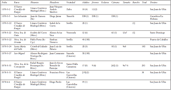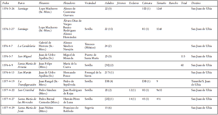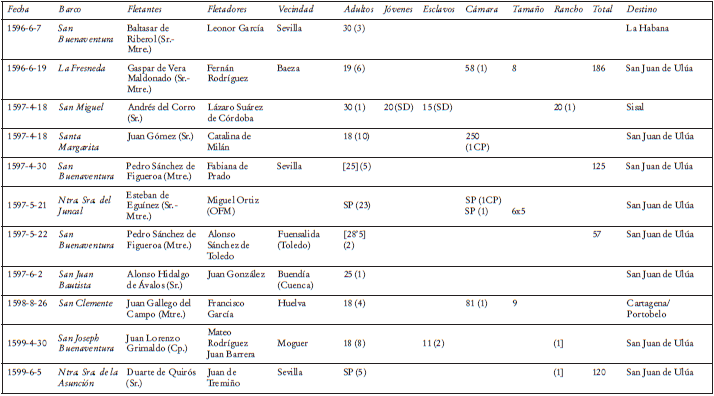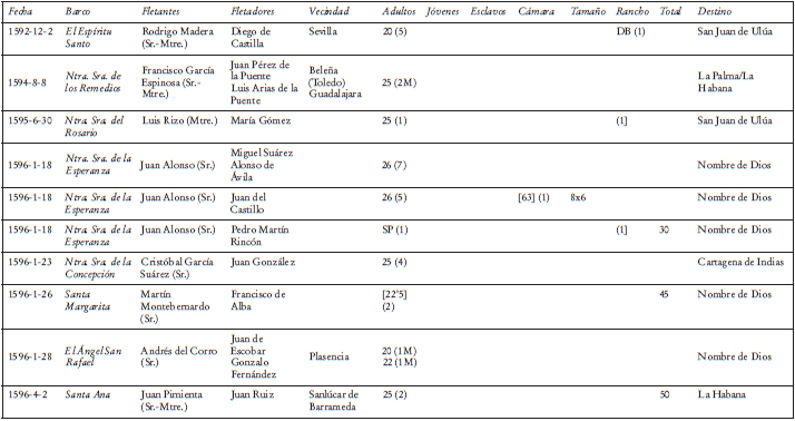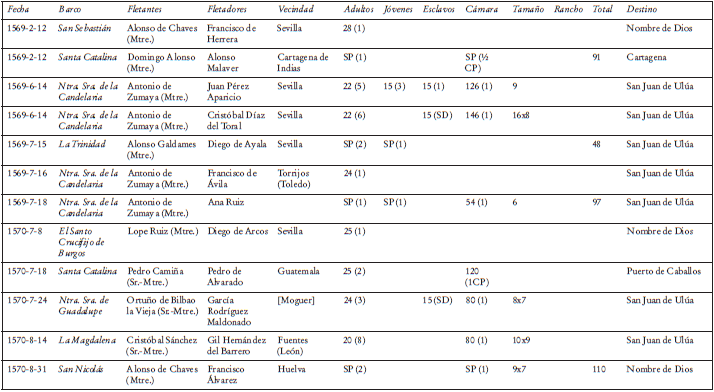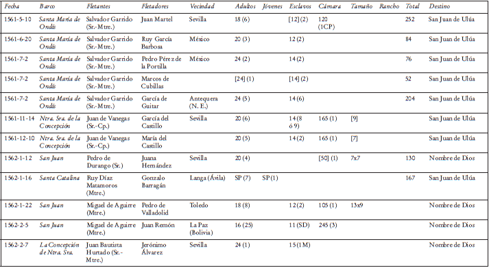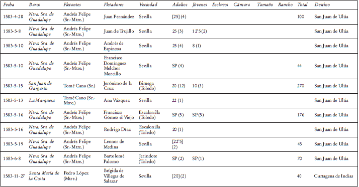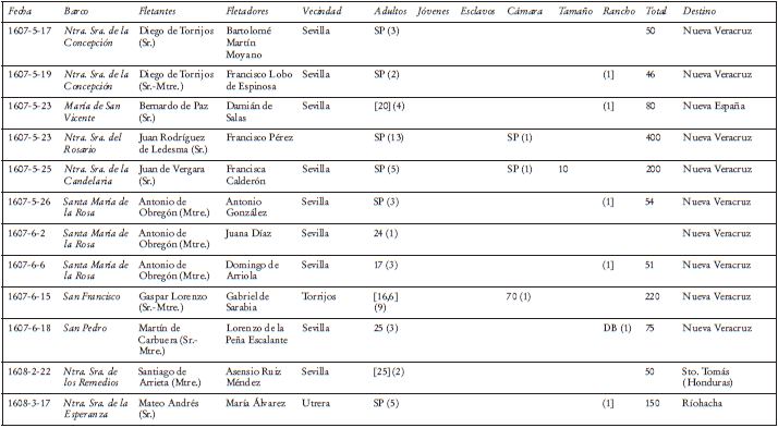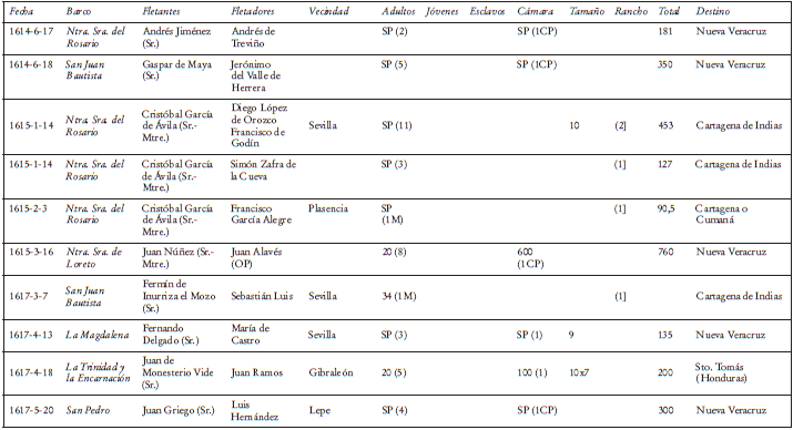 Quizá en la mayoría de los casos la emigración clandestina se produce sin el consentimiento de señores y maestres de naos —no lo sabemos, aunque sí que los pleitos incoados no fueron tan abundantes como se piensa—; pero su actitud a la hora de servir de filtro puede calificarse, como poco, de pasiva. De todos los contratos de pasaje consultados, solo unos cuantos hacen mención expresa en su tenor a que los pasajeros consignados en el fletamento deben poseer licencias de la Casa de la Contratación;128 el resto no hace ninguna referencia a cualquier trámite administrativo.