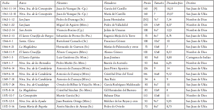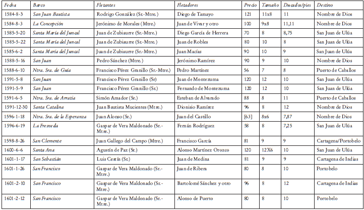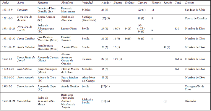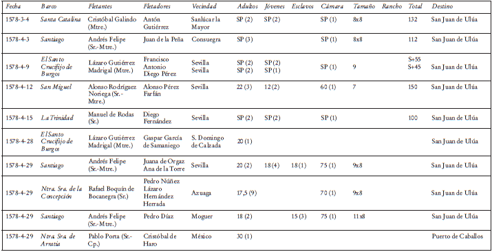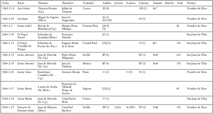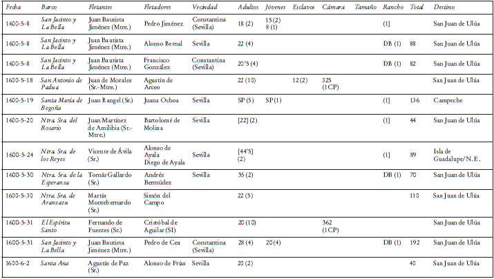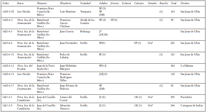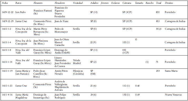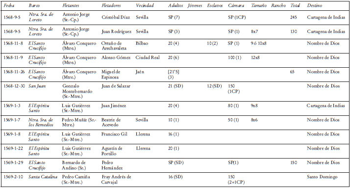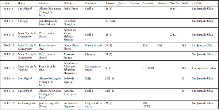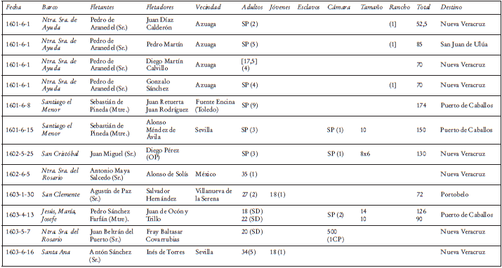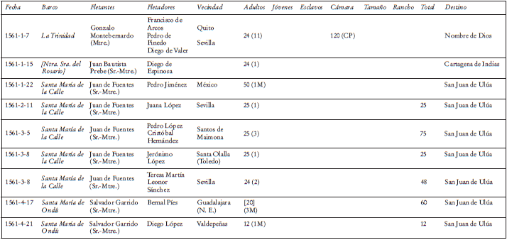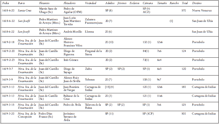 Cada fila, con su fecha correspondiente, hace referencia a un contrato de pasaje distinto. La ordenación seguida en las tablas es, por tanto, cronológica. La columna de los fletantes representa a la parte de la empresa naviera en el acto contractual, bien sea el propietario o señor de la nave (Sr.), bien su maestre (Mtre.), capitán (Cp.) o piloto (Pto.). En la mayoría de los casos son los propios dueños de las naos quienes sirven como maestres en ellas. En términos de diplomática documental, el fletante actúa como otorgante del documento. La columna de los fletadores representa a la parte de los pasajeros, es decir, quienes adquieren o contratan el servicio de transporte en la nave. Cuando aparece más de un nombre, no significa que sean los únicos pasajeros contenidos en el contrato, sino que todos los nominados son los responsables —como receptores del documento notarial— de la expedición, que puede estar constituida por más miembros cuyos nombres no se indican en el protocolo.