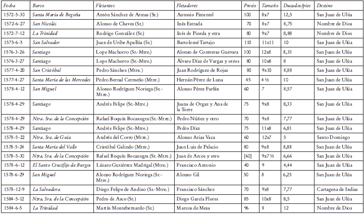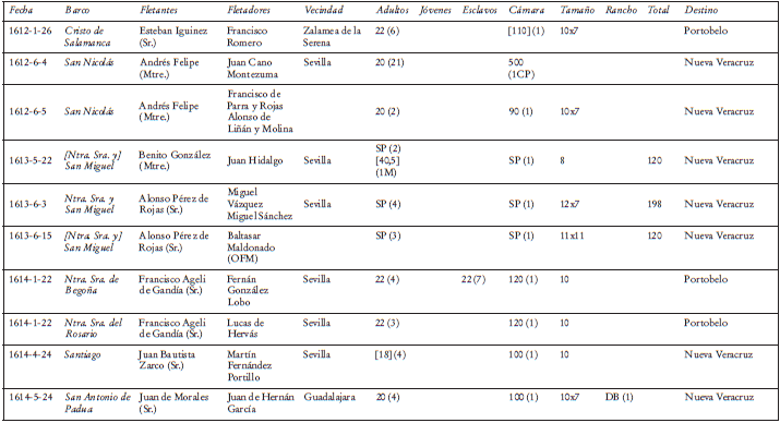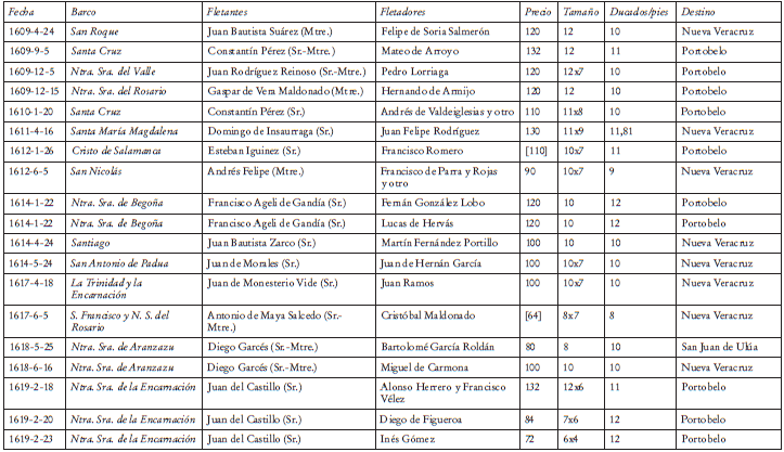 Ya en 1534 se dictan unas ordenanzas que prohíben a los maestres de naos el embarque de más de 60 pasajeros por cada 100 toneladas.117 Para 1576, esta proporción se ha reducido notablemente; así, la nao de Francisco Lobiano, La Concepción, de 500 toneladas, posee licencia de la Casa de la Contratación para llevar a 40 pasajeros y construir 6 cámaras;118 la nao Santa Clara, maestre Gonzalo Montebernardo, de 230 toneladas, puede embarcar 30 pasajeros y habilitar 4 cámaras;119 2 naves de 150 toneladas, la San Vicente y La Bella, tienen permiso para admitir a 20 pasajeros y preparar 4 cámaras.120 datos solo algo más cercanos a la realidad —aunque igualmente oficiales— se encuentran en los registros de los buques. En 1612, la nao Nuestra Señora de Gracia, de 400 toneladas, propiedad de Martín del Hoyo Setién y domingo Goracibay Arteaga, con destino a Tierra Firme en la flota del general Juan de la Cueva, registró 16 pasajeros a la ida y 8 en el tornaviaje;121 en la misma flota, la nao El Buen Jesús, de 380 toneladas, maestre Bernardino de Herrera, tiene registrados 32 pasajeros a la ida y 19 a la vuelta.122 En la flota de Nueva España de 1613, a cargo del general don Antonio de Oquendo, la Santa Beatriz, con 600 toneladas, maestre Martín de Aguirrea, lleva a 75 pasajeros, 29 de los cuales aparecen como criados del arzobispo de México, Juan Pérez de la Serna, que también viaja en la nao.123 Como puede suponerse, el número de pasajeros embarcados en una nave depende de la cantidad de ellas disponibles para cruzar el Atlántico, la calidad del buque —se preferiría los de mayor calidad y seguridad a los de peor condición— y el buen hacer del maestre o dueño de nao, que al fin y al cabo son los que han convencer a los pasajeros para que embarquen en su barco y no en otro.