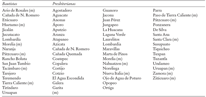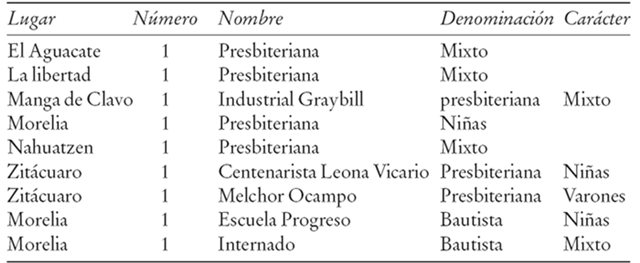 En Michoacán, el protestantismo estaba representado por los presbiterianos del norte (Zitácuaro 1876-1919), los metodistas del sur (Morelia 1880-1919), los bautistas del sur (Morelia 1893) y por los presbiterianos del sur (1919).3 Durante el porfiriato las misiones tuvieron un crecimiento constante y sin más contratiempos que los brotes de intolerancia religiosa de parte del clero y sectores católicos. Durante la transición política al maderismo, así como dentro de los primeros gobiernos constitucionalistas, el protestantismo no sufrió cambios considerables y continuó bajo la dirección de las misiones extranjeras, que seguían siendo las que tomaban las decisiones, dirigían las escuelas y ayudaban económicamente a las congregaciones, con ayuda de los dirigentes nacionales.