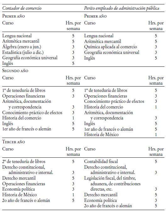 En 1845 se creó la primera escuela con este propósito bajo el nombre de Instituto Comercial. Unos años después, en 1854, cambió su nombre a Escuela Especial de Comercio y Administración. Luego de otros cambios de nombre de esta institución pública, en 1890 se le denominó Escuela Superior de Comercio y Administración (ESCA).6 La Ley de Enseñanza Comercial en el Distrito Federal de 1905 señalaba que dichos estudios comprendían la educación primaria y superior; la primera se impartía en escuelas primarias comerciales durante dos años y la segunda en la ESCA durante tres. En esta última se impartían tres carreras: contador de comercio, perito empleado de la administración pública y aspirante a carrera consular. En la Tabla 1 hemos sistematizado las materias cursadas por los alumnos en las dos primeras carreras. La tercera era similar a la formación de empleados, centro de interés de esta presentación.