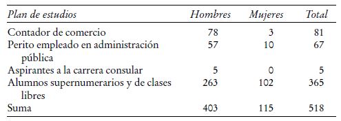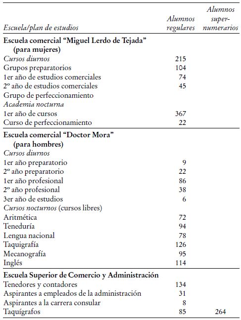 La educación primaria comercial comprendía “los siguientes estudios: Aritmética Mercantil, Teneduría de Libros, Lengua Nacional, Caligrafía, Escritura a máquina y taquigrafía, Francés o Inglés, Geografía económica de México, Conferencias de Economía Política, Derecho Usual Mercantil, Academias de Administración Mercantil e Historia de México”.7 Cabe señalar que la enseñanza primaria superior requería cuatro años adicionales a los cuatro años de educación elemental, “los dos primeros [de la primaria superior] de carácter general, son comunes a todos los alumnos y forzosos”, y los dos últimos estaban destinados “a iniciar a los alumnos en algún ramo determinado de actividad práctica, como industria, comercio, agricultura y minería”. En 1904 sólo había una escuela superior con el ciclo especial en el Distrito Federal y estaba dedicada a los ramos comerciales; era una escuela para niñas que tenía 130 alumnas en esta sección comercial.8