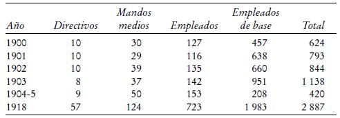 Aunque la categoría es utilizada por Mendieta en la década de 1940, nuestras propias observaciones demuestran que había diferencias marcadas entre los empleados en puestos técnicos y administrativos, de una parte, y los trabajadores sin capacitación. Al sistematizar los presupuestos entre 1900 y 1918 hay, al menos, cuatro tipos de empleados de acuerdo con sus ingresos. En primer lugar, encontramos a los funcionarios en puestos directivos, quienes tenían a su cargo direcciones generales de la administración municipal. En segundo lugar, ubicamos a mandos medios que son responsables de subdirecciones o jefaturas de sección. En tercero, están los empleados en sentido estricto, buena parte de ellos profesionistas o personal con capacitación técnica especializada en el manejo de equipo o para ciertas tareas administrativas o especializadas. Por último, se encuentran los empleados con salarios más bajos, algunos de ellos con trabajos precarizados, como las secretarias y los escribientes, y también se encontraba el personal de mantenimiento e intendencia, los vigilantes y obreros, entre otros. Estos últimos constituían la “burocracia obrera”, según Mendieta. Además de estos cuatro tipos, habría que sumar a los trabajadores temporales, cuyo número no aparece registrado en los presupuestos. Como lo hemos anotado en otro trabajo, en los presupuestos sólo aparece un monto dedicado a cubrir los servicios de este personal supernumerario.