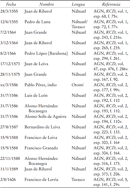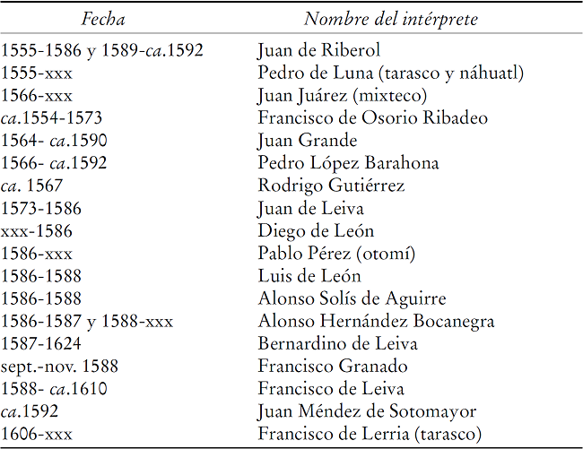 En resumidas cuentas, los titulares del oficio de intérprete de la Audiencia de México fueron indígenas (Hernando de Tapia, Juan Juárez y Pablo Pérez); conquistadores españoles casados con mujeres indígenas (Juan Pérez de Arteaga, Antonio Ortiz, Juan Freyle, Juan Grande y Álvaro de León); conquistadores que llegaron probablemente muy jóvenes a la Nueva España (Antonio Velázquez, Tomás de Rijoles, Álvaro de Zamora y Juan Gallego); mestizos, hijos de antiguos conquistadores y de madres indígenas (Pedro López de Barahona, Alonso Solís de Aguirre, Francisco Granado y Juan de León) o nietos y bisnietos de un conquistador español y de una mujer indígena (Juan de Leiva y Bernardino de Leiva); y criollos de padres españoles (Francisco de Osorio Ribadeo, Juan Méndez de Sotomayor y Juan de Riberol). Por lo tanto, aunque permanece la incógnita acerca de la identidad de algunos intérpretes de la Audiencia de México, se puede argüir que existió una indudable diversidad étnica entre los titulares del oficio en el siglo XVI. Guardando las proporciones, esta repartición se asemeja a la que se encuentra entre los intérpretes de la gobernación de Yucatán, donde este grupo estuvo conformado por un maya (Gaspar Antonio Chi), un hijo de conquistador español que llegó a la península de niño (Alonso de Arévalo), dos mestizos (Diego de Vargas y Antonio Nieto) y un criollo de padres españoles (Diego de Moras).83
