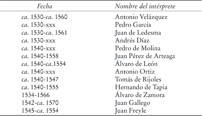 La información recogida permite identificar a dos generaciones de intérpretes. En la primera mitad del siglo XVI destacan los nahuatlatos Antonio Velázquez, Juan de Ledesma, Andrés Díaz, Pedro de Molina, Pedro García, Hernando de Tapia, Antonio Ortiz, Tomás de Rijoles, Juan Pérez Arteaga y Álvaro de León (Cuadro 2). La mayoría de aquellos titulares, que habían llegado a América en los primeros años de la conquista, fallecieron entre 1550 y 156044 El intérprete indígena Hernando de Tapia murió en 1555.45 También se puede argüir que Álvaro de Zamora, Juan Gallego y Juan Freyle fueron figuras de transición, a caballo entre la primera y la segunda mitad del siglo XVI. El primero empezó a prestar sus servicios en 1534, puesto que uno de los testigos presentados en su probanza de 1559 declaró que hacía “más de 25 años que vio que como tal intérprete hacía negocios ante el licenciado Salmerón que a la sazón presidía en esta dicha Audiencia”.46 Debió de fallecer en 1566, fecha en la que se estipuló que Pedro López Barahona lo sustituiría en el cargo.47 Juan Gallego, por su lado, declaró en su probanza que fue intérprete desde 1542 y que, a partir de 1554, también asumió otras funciones, como la de juez de comisión.48 Este titular siguió ejerciendo el cargo por lo menos hasta 1570, puesto que en 1563 y 1567 presentó peticiones en su nombre y en el de “los demás intérpretes” de la Audiencia de México y también está identificado como intérprete en un documento de 1570.49 Finalmente, Juan Freyle comenzó a prestar sus servicios de intérprete en 1545 y siguió ocupando el cargo hasta por lo menos 1554, año en el que menciona esta actividad en su probanza de méritos y servicios.50